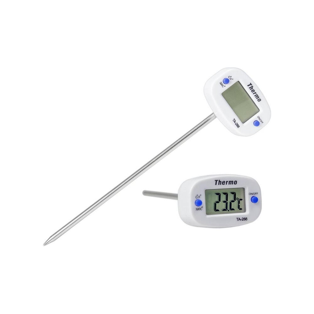 Кухонный пищевой термометр ТА288 с иглой предназначен для измерения температуры. Щуп опускается в жидкое, газовое или рыхлое вещество, температуру которого необходимо измерить. Для удобства электронный термометр имеет дисплей регулировкой 180 °. Прибор очень точный, погрешность его показаний +/- 1 градус, а точность шкалы измерения – 0.1 градус. Дополнительные характеристики: Диапазон измерений – от -50 до +300 °С; Температура – C/F; Автоотключение – есть; Питание – 1 батарейка-таблетка G13/LR44/357A (входит в комплект); Точность измерения: ±1°C; Градация дисплея: 0.1 градус; Длительность теста: 2-3 секунды; Длительность работы от 1-ой батареи: 5000 часов; Размеры: диаметр щупа – 4 мм; длина щупа – 135 мм.