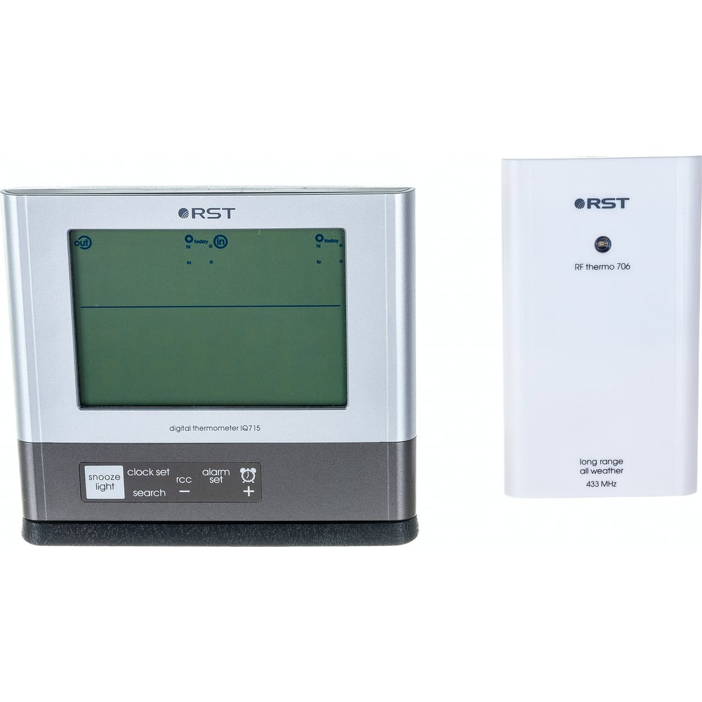 Электронный термометр с радиодатчиком RST RST02715 представляет собой многофункциональный прибор. Основные функции модели: внутренняя и внешняя температура воздуха и тенденции их изменения, память максимальных и минимальных значений за текущие сутки и за весь период с возможностью сброса показаний, время и календарь с возможностью автосинхронизации с сигналами точного времени rcc 77.5, два независимых будильника, сигнализация опасности гололеда. Дисплей оснащен мягкой оранжевой подсветкой с функцией затухания "крещендо". Данные о внешней температуре поступают от удаленного радиодатчика на расстоянии до 50 м (при отсутствии помех).