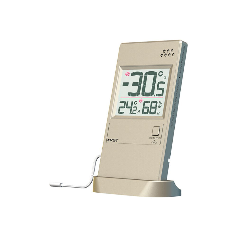 Оконный термогигрометр с выносным термосенсором RST, шампань RST01596 позволяет измерить температуру воздуха в помещении и на улице, относительную влажность воздуха в помещении, проследить за тенденцией их изменения, сигнализирует о возможности гололеда. Фиксирует в памяти максимальные и минимальные измеренные значения за текущие сутки и за весь период с возможностью сброса показаний. Предназначен для крепления на оконной раме или другой поверхности при помощи двустороннего скотча. Может быть удобно установлен на входящей в комплект подставке. Термосенсор для измерения внешней температуры выносится за окно, легко прижимается рамой и незаметно крепится скотчем.