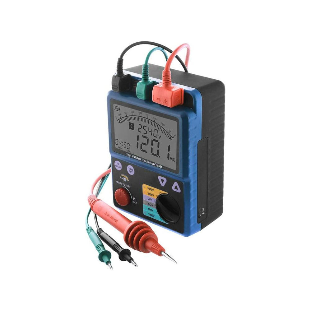 Измеритель сопротивления изоляции с поверкой - мегаомметр МЕГЕОН 13900 к0000021269 представляет собой портативный контрольно-измерительный прибор для проверки сопротивления изоляции. Для проведения испытаний имеются пять тестовых напряжений: 500В, 1000В, 2500В, 5000В. Предусмотрено выключение испытательного напряжения по окончании измерения. Яркая светодиодная подсветка дисплея позволяет работать в условиях недостаточной видимости или при отсутствии освещения. Для сохранения уровня заряда элементов питания предусмотрена функция автоматического выключения питания. Измеритель сопротивления изоляции (мегаомметр) внесен в государственный реестр СИ, под номером 74507-19, срок периодической поверки составляет 2 года.