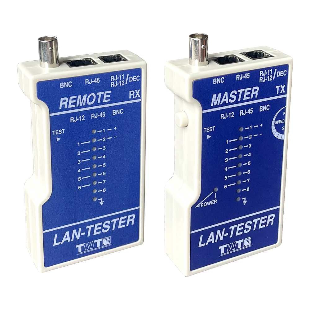 Тестер для витой пары TWT RJ-45 телефонного RJ-12 RJ-11 коаксиального кабеля BNC TST-200 имеет два модуля: блок передатчика и блок приемника. После подключения передатчика к одному концу кабеля, а приемник к другому тестер позволяет определить следующие повреждения: закороченные пары проводов; открытые пары проводов; перекрестные пары проводов; реверсивные пары проводов; перемещенные пары проводов; расщепленные пары проводов.