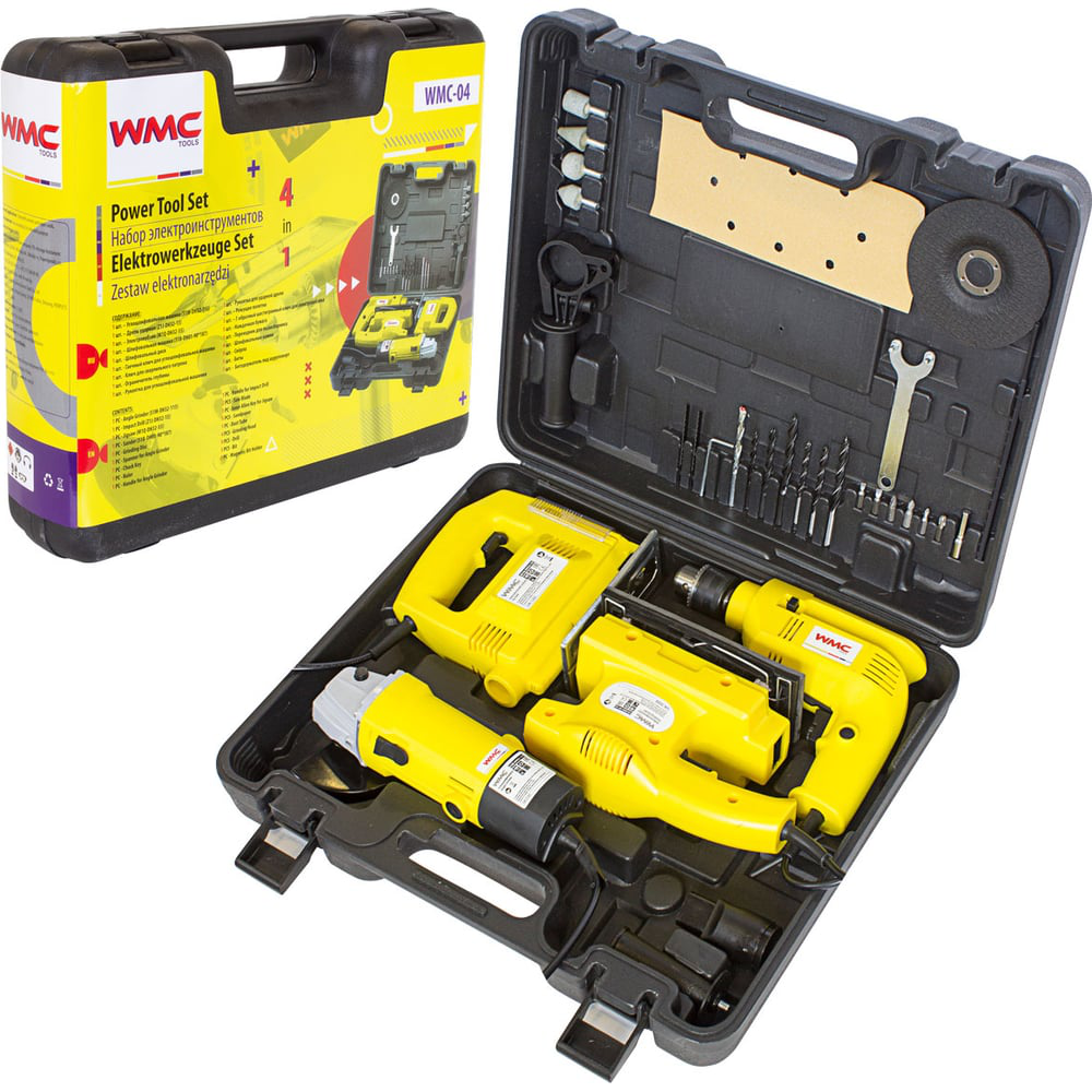 Набор электроинструмента WMC-04 состоит из ударной дрели, лобзика, углошлифовальной машины и прямой шлифмашины с небольшим набором необходимых расходных аксессуаров к перечисленным инструментам. Данный набор с легкостью поможет справиться с любой поставленной задачей дома, в гараже, на даче и в любом другом месте с электричеством. Важно помнить, что данный инструмент не является профессиональным, а потому во избежании поломок не стоит перегружать и перегревать инструмент. Весь инструмент компактно уложен в пластиковый кейс, что очень сильно экономит место и помогает поддерживать инструмент в чистоте.