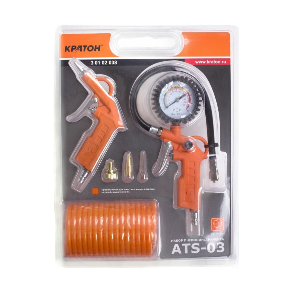 Набор пневмоинструментов Кратон ATS-03 3 01 02 038 может использоваться в автомастерских для выполнения различных операций. Продувочный пистолет предназначен для очистки различных поверхностей струей сжатого воздуха. Пистолет для накачки шин оснащен манометром для контроля за уровнем остаточного давления в шинах. Все инструменты имеют большой рабочий ресурс и позволяют работать без остановки в течение длительного времени.