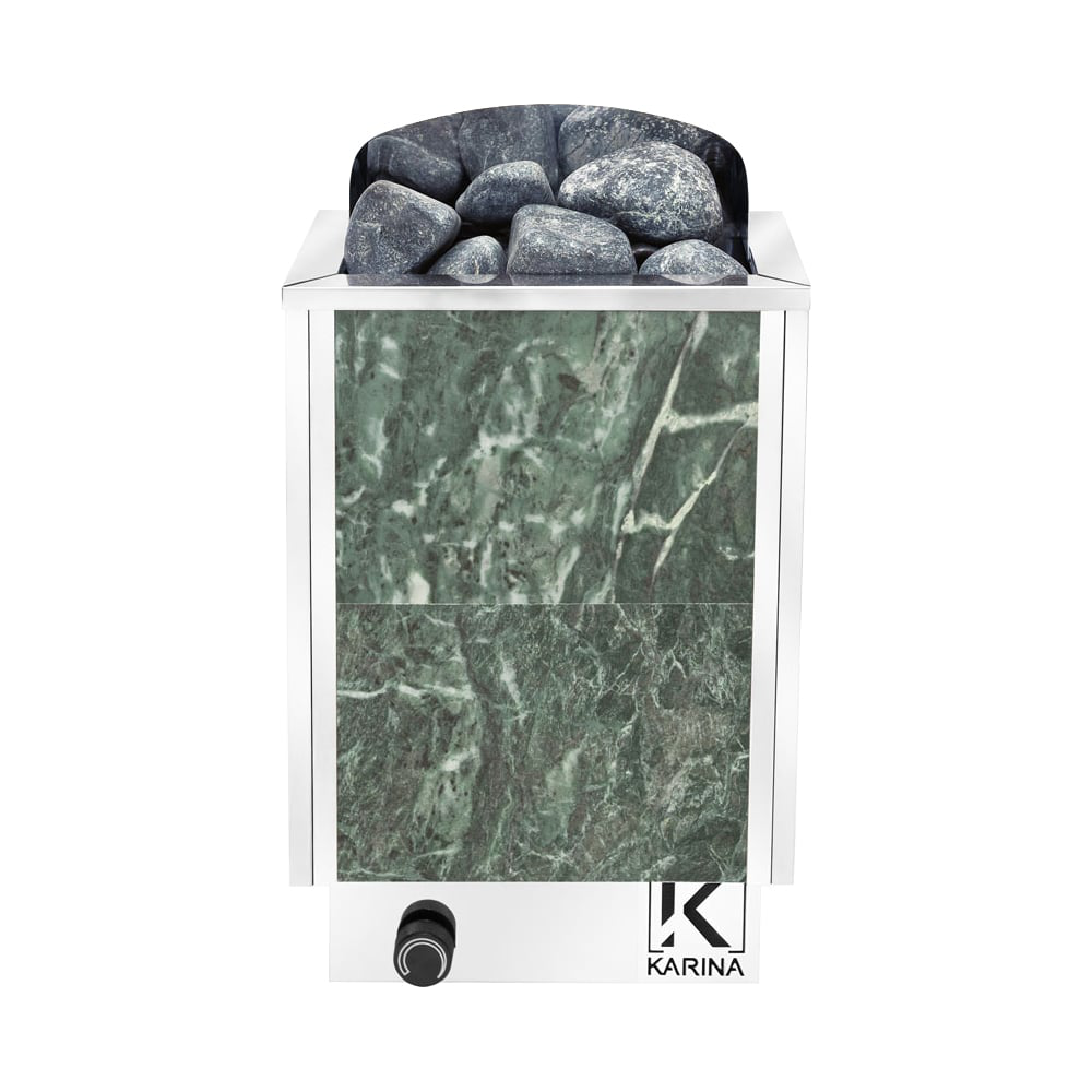 Электрическая печь Karina Trend 2,5 Змеевик Tr-2,5-220-Z подходит для обогрева домашних бань и саун объемом от 2 до 3 куб.м. Для удобной эксплуатации в комплект поставки входит встроенный пульт управления. С помощью него пользователь легко может регулировать температуру нагрева воздуха. Облицовка из змеевика придает устройству стильный и современный вид.