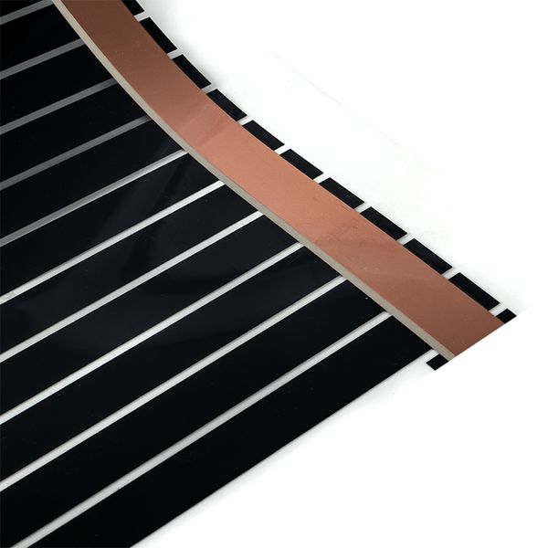 Пленочный теплый пол EKF применяется для сухого монтажа без стяжки не только при капитальном ремонте, но и при косметическом. Толщина пленки -0,338 мм. Обеспечивает быстрый и легкий монтаж. Идеально подходит для укладки под ламинат, паркетную доску, мягкое напольное покрытие: линолеум, ковролин. Инфракрасный пленочный теплый пол состоит из следующих элементов. Полосы углеродного материала шириной около 1,5 см соединены между собой при помощи медных шин с серебряным покрытием, которые и проводят электрический ток. Нагревательный элемент заламинирован с двух сторон плотным полимером, который не задерживает инфракрасное излучение и обеспечивает отличную защиту от попадания влаги, пробоев и возгорания.