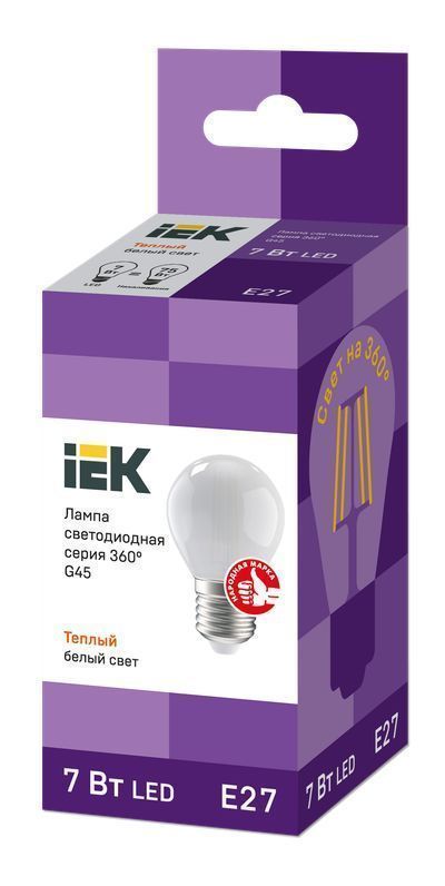 Лампа LED G45 шар матов. 7Вт 230В 3000К E27 серия 360° IEK с нитевидным светодиодом (филаментная нить) является одним из самых эффективных источников света. Главное отличие от обычных светодиодных ламп – угол рассеивания света до 360° (дополнительный комфорт для глаз). Лампа применяется в осветительных приборах бытового назначения. Представлены в 3 вариантах: с прозрачной, золоченой и матовой колбами. Соответствуют требованиям Технических регламентов Таможенного союза ТР ТС 004/2011, ТР ТС 020/2011, МЭК 62560 и постановления Правительства РФ от 10.11.2017 № 1356.
