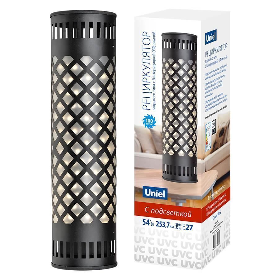 Расширенная гарантия на товар составляет 2 года. поставщик рекомендует использовать лампы накаливания с цоколем E27 для освещения площади 3 м2. Ультрафиолетовый бактерицидный рециркулятор Uniel UDG-V100A UVCB/6500K D01 Black UL-00007989 в современном стиле используется в интерьере Для офиса с установкой На стол.