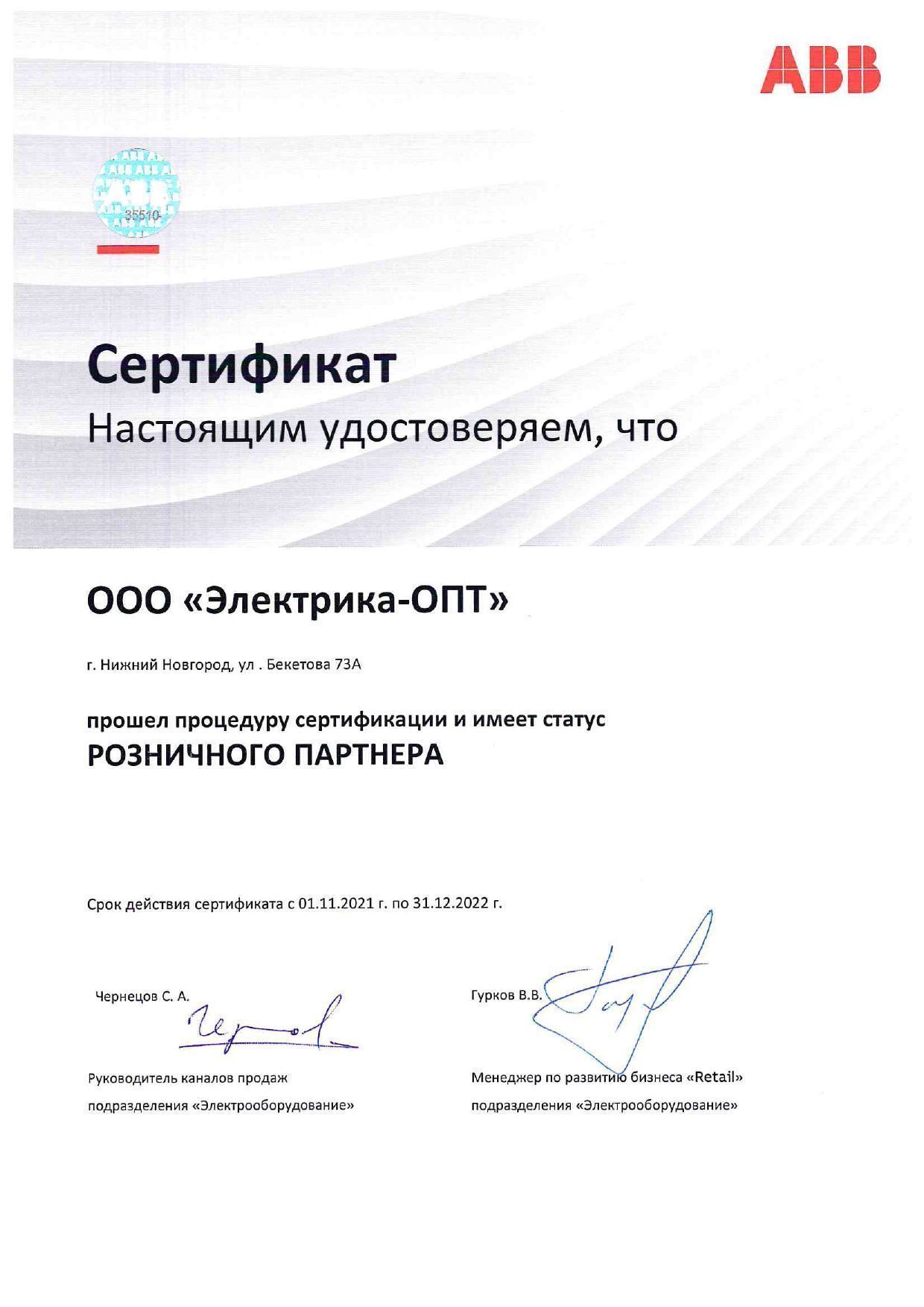 Компания ООО «Электрика-ОПТ» получила статус сертифицированного розничного партнера компании ABB