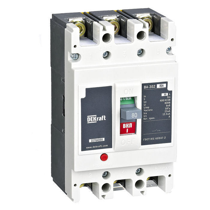 DEKraft ВА-300 имеет трехполюсную конструкцию, что делает его универсальным и подходящим для различных систем электроснабжения. Он оснащен автоматическим механизмом срабатывания при превышении заданного значения тока или при возникновении короткого замыкания. Это гарантирует быструю реакцию и надежную защиту оборудования и проводки.