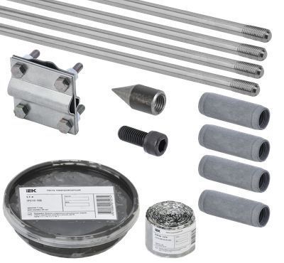 Комплект заземления товарного знака IEK используется для организации заземляющего устройства жилых объектов, объектов энергетического и промышленного комплексов, объектов связи. Данный комплект монтируется на глубину 6 метров путём последовательного соединения и заглубления стержней с помощью перфоратора или кувалды. Стержни комплекта имеют резьбу на обоих концах и соединяются между собой посредством муфт. Для обеспечения надёжного электрического контакта места соединения смазывают токопроводящей пастой. При монтаже в муфту, с противоположной стороны от стержня, вкручивается удароприёмная головка, которая принимает на себя энергию ударного молотка, не допуская деформации стержней заземления и соединительной муфты, в которую плотно вкручивается. Верхний заземлитель подключают с помощью зажима к горизонтальному проводнику системы молниезащиты. Данное соединение сверху закрывают изоляционной лентой для защиты от попадания влаги и образования коррозии.